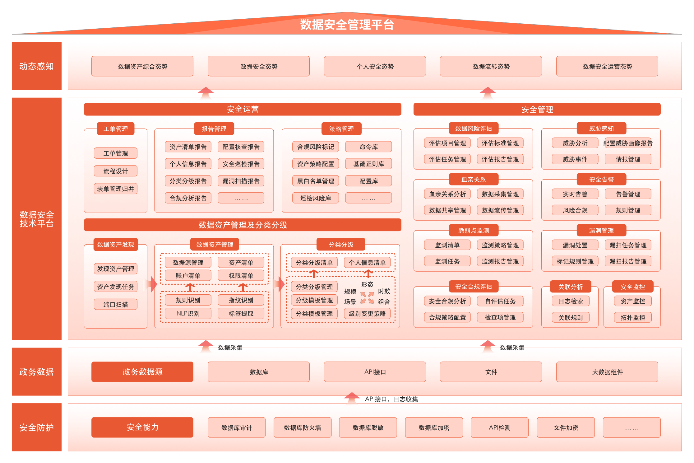 数据安全管理平台以数据为核心,聚焦数据资产治理与安全防护需求,构建覆盖数据资产盘点、分类分级、策略协同及风险态势感知的一体化防护体系。